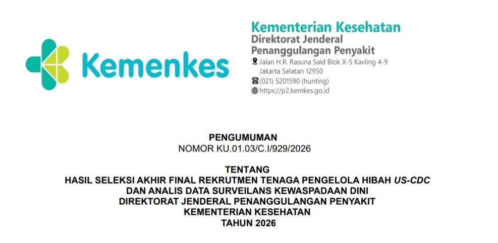 Pengumuman Hasil Seleksi Akhir Rekrutmen Tenaga Pengelola Hibah US-CDC dan Analis Data Surveilans Kewaspadaan Dini Tahun 2026