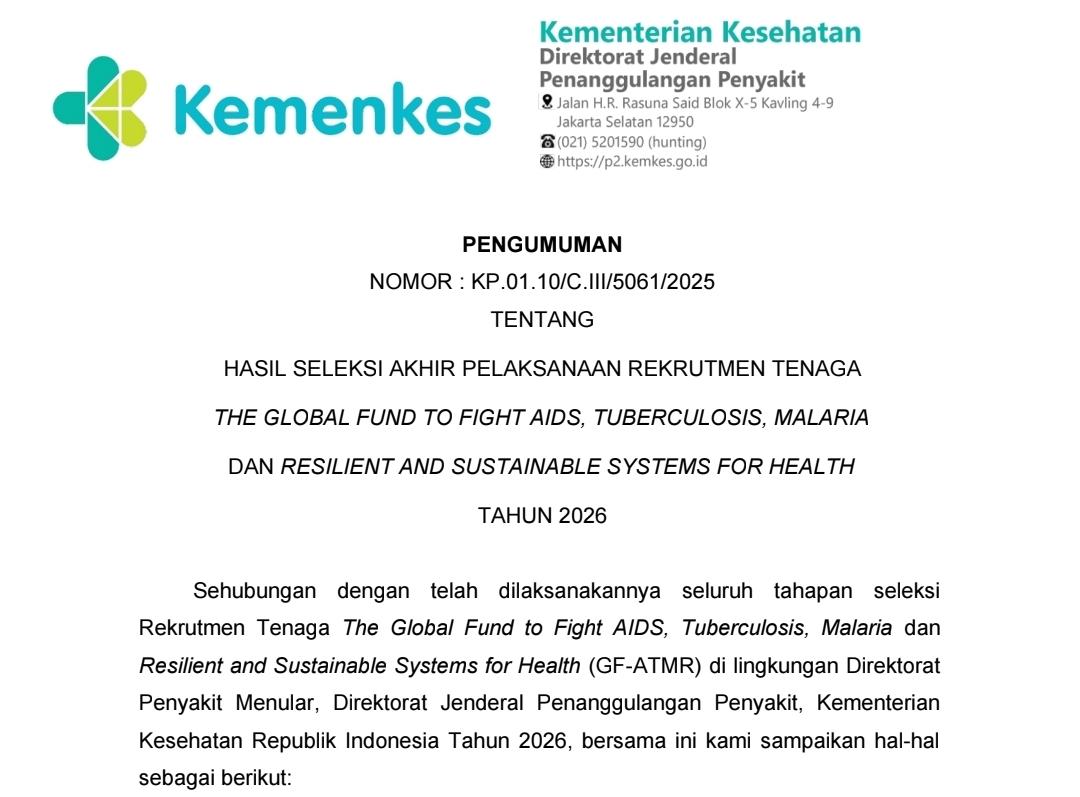 Sehubungan dengan telah selesainya seluruh tahapan seleksi Rekrutmen Tenaga The Global Fund to Fight AIDS, Tuberculosis, Malaria dan Resilient and Sustainable Systems for Health (GF-ATMR) di lingkungan Direktorat Penyakit Menular, Direktorat Jenderal Penanggulangan Penyakit, Kementerian Kesehatan Republik Indonesia Tahun 2026, bersama ini kami sampaikan hasil seleksi akhir kepada para peserta. Seluruh proses seleksi telah dilaksanakan secara objektif, transparan, dan akuntabel sesuai dengan ketentuan yang berlaku.