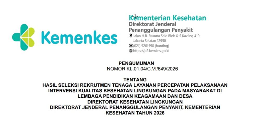 PENGUMUMAN HASIL SELEKSI REKRUTMEN TENAGA LAYANAN PERCEPATAN PELAKSANAAN INTERVENSI KUALITAS KESEHATAN LINGKUNGAN PADA MASYARAKAT DI LEMBAGA PENDIDIKAN KEAGAMAAN DAN DESA