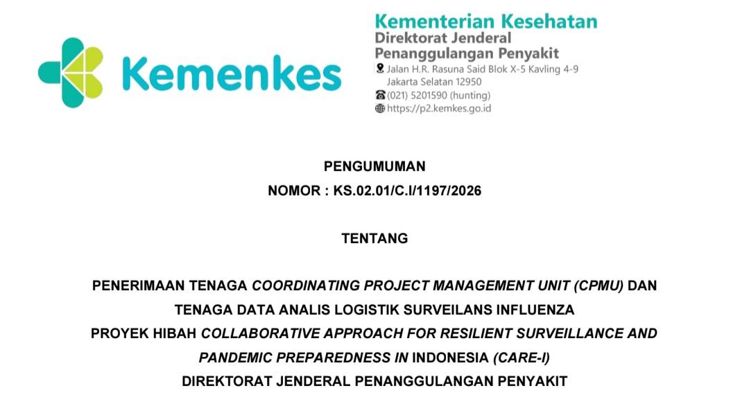 PENGUMUMAN PENERIMAAN TENAGA COORDINATING PROJECT MANAGEMENT UNIT (CPMU) DAN TENAGA DATA ANALIS LOGISTIK SURVEILANS INFLUENZA PROYEK HIBAH COLLABORATIVE APPROACH FOR RESILIENT SURVEILLANCE AND PANDEMIC PREPAREDNESS IN INDONESIA (CARE-I)