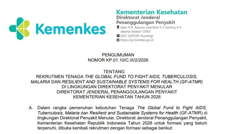 Sehubungan dengan upaya penguatan program penanggulangan HIV, Tuberkulosis, Malaria, serta penguatan sistem kesehatan yang tangguh dan berkelanjutan, Direktorat Penyakit Menular, Direktorat Jenderal Penanggulangan Penyakit, Kementerian Kesehatan membuka kesempatan rekrutmen tenaga untuk mendukung pelaksanaan program The Global Fund to Fight AIDS, Tuberculosis, Malaria dan Resilient and Sustainable Systems for Health (GF-ATMR) Tahun 2026.